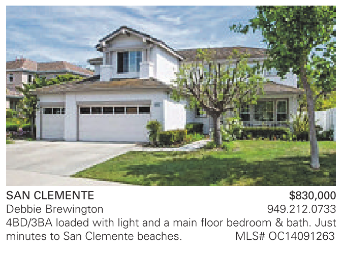 SAN CLEMENTE $830,000 Debbie Brewington 949.212.0733 4BD/3BA loaded with light and a main floor bedroom & bath. Just minutes to San Clemente beaches. MLS# OC14091263