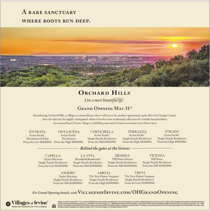 Villages of Irvine®, Orchard Hills™, Live amore bountiful life® and Irvine Pacific® are trademarks of The Irvine CompanyLLC, used for marketing villages of new homes in Irvine, California USA.All projects are in planned communities developed by Irvine Community Development CompanyLLC, an affiliate of The Irvine CompanyLLC.“Masterfully Planned by The Irvine Company” means thatthe Irvine Companycreated the master land plan for all Irvine Companycommunities. The “master land plan” includes the overall entitlement and design of each community but does not include the design, construction and sale of homes.The design, construction and sale of homes is the sole responsibility of community builders.Amenities, plans, pricing and product illustrations are subject to change. ©2014 The Irvine CompanyLLC.All Rights Reserved. 5/2014