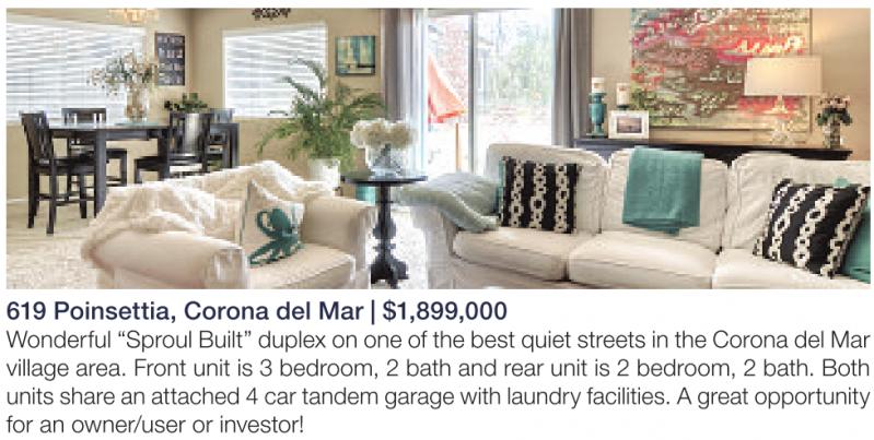 619 Poinsettia, Corona del Mar | $1,899,000 Wonderful “Sproul Built” duplex on one of the best quiet streets in the Corona del Mar village area. Front unit is 3 bedroom, 2 bath and rear unit is 2 bedroom, 2 bath. Both units share an attached 4 car tandem garage with laundry facilities. A great opportunity for an owner/user or investor!