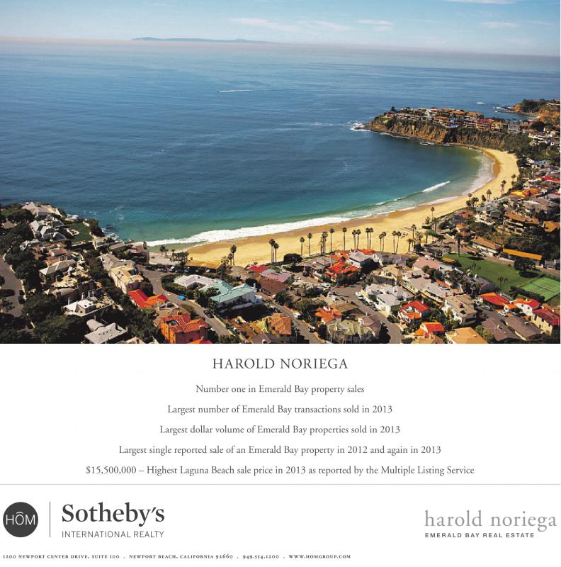 HAROLD NORIEGA Number one in Emerald Bay property sales Largest number of Emerald Bay transactions sold in 2013 Largest dollar volume of Emerald Bay properties sold in 2013 Largest single reported sale of an Emerald Bay property in 2012 and again in 2013 $15,500,000 – Highest Laguna Beach sale price in 2013 as reported by the Multiple Listing Service 1200 newport center drive, suite 100 . newport beach, california 92660 . 949.554.1200 . www.homgroup.com