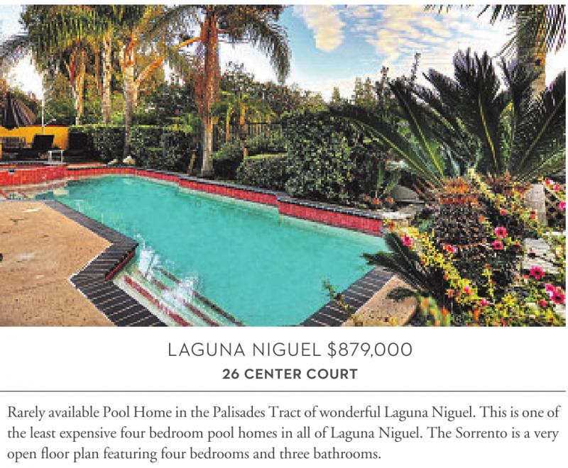 LAGUNA NIGUEL $879,000 26 CENTER COURT Rarely available Pool Home in the Palisades Tract of wonderful Laguna Niguel. This is one of the least expensive four bedroom pool homes in all of Laguna Niguel. The Sorrento is a very open floor plan featuring four bedrooms and three bathrooms.