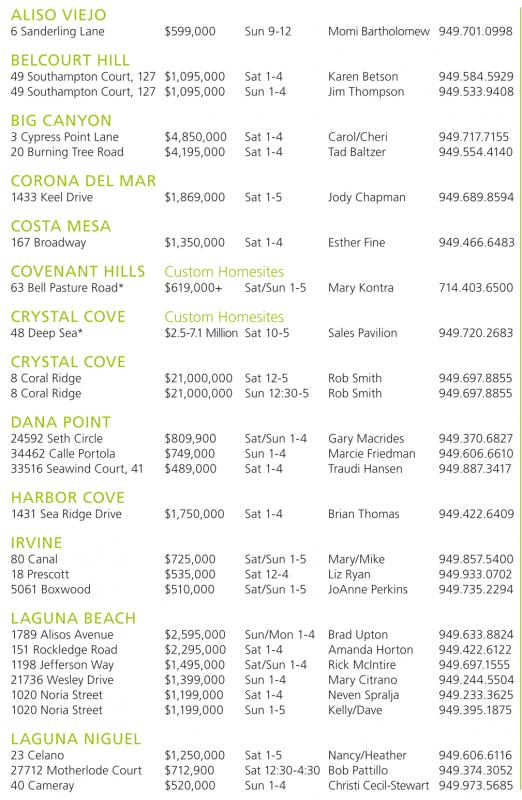 ALISO VIEJO 6 Sanderling Lane $599,000 Sun 9-12 Momi Bartholomew 949.701.0998 BELCOURT HILL 49 Southampton Court, 127 $1,095,000 Sat 1-4 Karen Betson 949.584.5929 49 Southampton Court, 127 $1,095,000 Sun 1-4 Jim Thompson 949.533.9408 BIG CANYON 3 Cypress Point Lane $4,850,000 Sat 1-4 Carol/Cheri 949.717.7155 20 Burning Tree Road $4,195,000 Sat 1-4 Tad Baltzer 949.554.4140 CORONA DEL MAR 1433 Keel Drive $1,869,000 Sat 1-5 Jody Chapman 949.689.8594 COSTA MESA 167 Broadway $1,350,000 Sat 1-4 Esther Fine 949.466.6483 COVENANT HILLS Custom Homesites 63 Bell Pasture Road* $619,000+ Sat/Sun 1-5 Mary Kontra 714.403.6500 CRYSTAL COVE Custom Homesites 48 Deep Sea* $2.5-7.1Million Sat 10-5 Sales Pavilion 949.720.2683 CRYSTAL COVE 8 Coral Ridge $21,000,000 Sat 12-5 Rob Smith 949.697.8855 8 Coral Ridge $21,000,000 Sun 12:30-5 Rob Smith 949.697.8855 DANA POINT 24592 Seth Circle $809,900 Sat/Sun 1-4 Gary Macrides 949.370.6827 34462 Calle Portola $749,000 Sun 1-4 Marcie Friedman 949.606.6610 33516 Seawind Court, 41 $489,000 Sat 1-4 Traudi Hansen 949.887.3417 HARBOR COVE 1431 Sea Ridge Drive $1,750,000 Sat 1-4 Brian Thomas 949.422.6409 IRVINE 80 Canal $725,000 Sat/Sun 1-5 Mary/Mike 949.857.5400 18 Prescott $535,000 Sat 12-4 Liz Ryan 949.933.0702 5061 Boxwood $510,000 Sat/Sun 1-5 JoAnne Perkins 949.735.2294 LAGUNA BEACH 1789 Alisos Avenue $2,595,000 Sun/Mon 1-4 Brad Upton 949.633.8824 151 Rockledge Road $2,295,000 Sat 1-4 Amanda Horton 949.422.6122 1198 Jefferson Way $1,495,000 Sat/Sun 1-4 Rick McIntire 949.697.1555 21736 Wesley Drive $1,399,000 Sun 1-4 Mary Citrano 949.244.5504 1020 Noria Street $1,199,000 Sat 1-4 Neven Spralja 949.233.3625 1020 Noria Street $1,199,000 Sun 1-5 Kelly/Dave 949.395.1875 LAGUNA NIGUEL 23 Celano $1,250,000 Sat 1-5 Nancy/Heather 949.606.6116 27712 Motherlode Court $712,900 Sat 12:30-4:30 Bob Pattillo 949.374.3052 40 Cameray $520,000 Sun 1-4 Christi Cecil-Stewart 949.973.5685