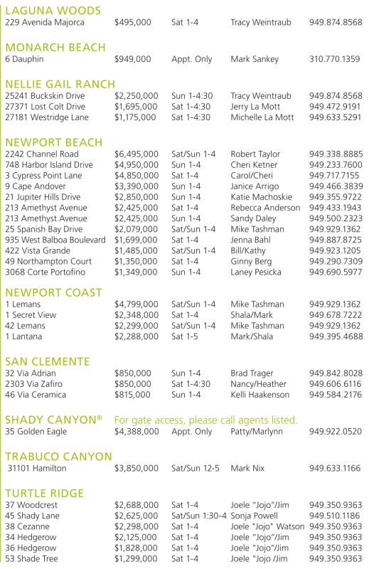 NELLIE GAIL RANCH 25241 Buckskin Drive $2,250,000 Sun 1-4:30 Tracy Weintraub 949.874.8568 27371 Lost Colt Drive $1,695,000 Sat 1-4:30 Jerry La Mott 949.472.9191 27181 Westridge Lane $1,175,000 Sat 1-4:30 Michelle La Mott 949.633.5291 NEWPORT BEACH 2242 Channel Road $6,495,000 Sat/Sun 1-4 Robert Taylor 949.338.8885 748 Harbor Island Drive $4,950,000 Sun 1-4 Cheri Ketner 949.233.7600 3 Cypress Point Lane $4,850,000 Sat 1-4 Carol/Cheri 949.717.7155 9 Cape Andover $3,390,000 Sun 1-4 Janice Arrigo 949.466.3839 21 Jupiter Hills Drive $2,850,000 Sun 1-4 Katie Machoskie 949.355.9722 213 Amethyst Avenue $2,425,000 Sat 1-4 Rebecca Anderson 949.433.1943 213 Amethyst Avenue $2,425,000 Sun 1-4 Sandy Daley 949.500.2323 25 Spanish Bay Drive $2,079,000 Sat/Sun 1-4 Mike Tashman 949.929.1362 935 West Balboa Boulevard $1,699,000 Sat 1-4 Jenna Bahl 949.887.8725 422 Vista Grande $1,485,000 Sat/Sun 1-4 Bill/Kathy 949.923.1205 49 Northampton Court $1,350,000 Sat 1-4 Ginny Berg 949.290.7309 3068 Corte Portofino $1,349,000 Sun 1-4 Laney Pesicka 949.690.5977 NEWPORT COAST 1 Lemans $4,799,000 Sat/Sun 1-4 Mike Tashman 949.929.1362 1 Secret View $2,348,000 Sat 1-4 Shala/Mark 949.678.7222 42 Lemans $2,299,000 Sat/Sun 1-4 Mike Tashman 949.929.1362 1 Lantana $2,288,000 Sat 1-5 Mark/Shala 949.395.4688 SAN CLEMENTE 32 Via Adrian $850,000 Sun 1-4 Brad Trager 949.842.8028 2303 Via Zafiro $850,000 Sat 1-4:30 Nancy/Heather 949.606.6116 46 Via Ceramica $815,000 Sun 1-4 Kelli Haakenson 949.584.2176 SHADY CANYON ® For gate access, please call agents listed. 35 Golden Eagle $4,388,000 Appt. Only Patty/Marlynn 949.922.0520 TRABUCO CANYON 31101 Hamilton $3,850,000 Sat/Sun 12-5 Mark Nix 949.633.1166