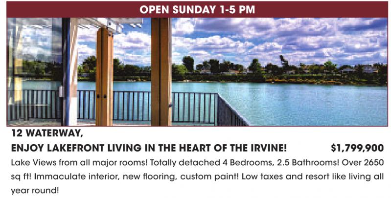 OPEN SUNDAY 1-5 PM 12 WATERWAY, ENJOY LAKEFRONT LIVING IN THE HEART OF THE IRVINE! $1,799,900 Lake Views from all major rooms! Totally detached 4 Bedrooms, 2.5 Bathrooms! Over 2650 sq ft! Immaculate interior, new flooring, custom paint! Low taxes and resort like living all year round! See also