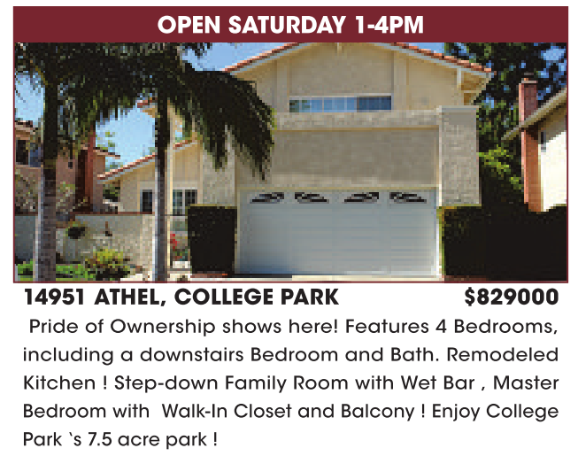 OPEN SATURDAY 1-4PM 14951 ATHEL, COLLEGE PARK $829000 Pride of Ownership shows here! Features 4 Bedrooms, including a downstairs Bedroom and Bath. Remodeled Kitchen ! Step-down Family Room with Wet Bar , Master Bedroom with Walk-In Closet and Balcony ! Enjoy College Park ‘s 7.5 acre park !