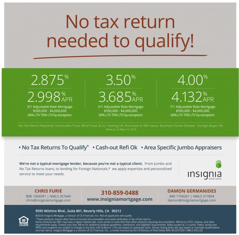 ©2014 Insignia Mortgage, a division of CS Financial, Inc. Not all applicants will qualify. *These products require other forms of income documentation and asset verification in lieu of tax returns. Some products we offer may have ahigher interest rate, more points or more fees than other products requiring documentation. Minimum FICO, reserve, and other requirements apply. Contact your loan officer for additional program guidelines, restrictions, and eligibility requirements. Rates quoted at 1.5 points. Rates, points and APRs and programs are subject to change at any time until locked-in. LTVs are based on appraised value. Actual closing times will vary based on borrower qualifications and loan terms. Insignia Mortgage is adivision of CS Financial, Inc., abroker licensed by the CA Bureau of Real Estate BRE #01257559 |NMLS #31132