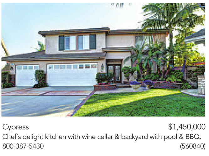 Cypress $1,450,000 Chef’s delight kitchen with wine cellar &backyard with pool &BBQ. 800-387-5430 (560840)