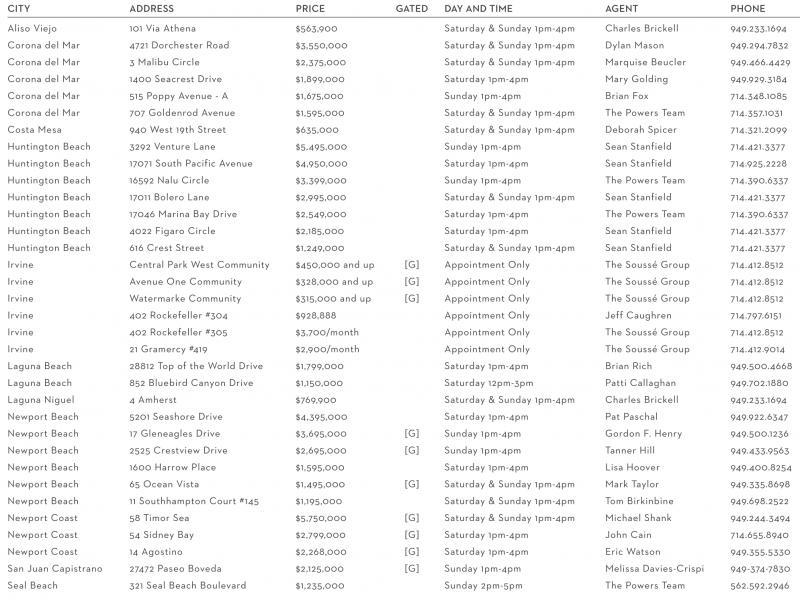 Corona del Mar 4721 Dorchester Road $3,550,000 Saturday & Sunday 1pm-4pm Dylan Mason 949.294.7832 Corona del Mar 3 Malibu Circle $2,375,000 Saturday & Sunday 1pm-4pm Marquise Beucler 949.466.4429 Corona del Mar 1400 Seacrest Drive $1,899,000 Saturday 1pm-4pm Mary Golding 949.929.3184 Corona del Mar 515 Poppy Avenue - A $1,675,000 Sunday 1pm-4pm Brian Fox 714.348.1085 Corona del Mar 707 Goldenrod Avenue $1,595,000 Saturday & Sunday 1pm-4pm The Powers Team 714.357.1031 Costa Mesa 940 West 19th Street $635,000 Saturday & Sunday 1pm-4pm Deborah Spicer 714.321.2099 Huntington Beach 3292 Venture Lane $5,495,000 Sunday 1pm-4pm Sean Stanfield 714.421.3377 Huntington Beach 17071 South Pacific Avenue $4,950,000 Saturday 1pm-4pm Sean Stanfield 714.925.2228 Huntington Beach 16592 Nalu Circle $3,399,000 Sunday 1pm-4pm The Powers Team 714.390.6337 Huntington Beach 17011 Bolero Lane $2,995,000 Saturday & Sunday 1pm-4pm Sean Stanfield 714.421.3377 Huntington Beach 17046 Marina Bay Drive $2,549,000 Saturday 1pm-4pm The Powers Team 714.390.6337 Huntington Beach 4022 Figaro Circle $2,185,000 Saturday 1pm-4pm Sean Stanfield 714.421.3377 Huntington Beach 616 Crest Street $1,249,000 Saturday & Sunday 1pm-4pm Sean Stanfield 714.421.3377 Irvine Central Park West Community $450,000 and up [G] Appointment Only The Soussé Group 714.412.8512 Irvine Avenue One Community $328,000 and up [G] Appointment Only The Soussé Group 714.412.8512 Irvine Watermarke Community $315,000 and up [G] Appointment Only The Soussé Group 714.412.8512 Irvine 402 Rockefeller #304 $928,888 Appointment Only Jeff Caughren 714.797.6151 Irvine 402 Rockefeller #305 $3,700/month Appointment Only The Soussé Group 714.412.8512 Irvine 21 Gramercy #419 $2,900/month Appointment Only The Soussé Group 714.412.9014 Laguna Beach 28812 Top of the World Drive $1,799,000 Saturday 1pm-4pm Brian Rich 949.500.4668 Laguna Beach 852 Bluebird Canyon Drive $1,150,000 Saturday 12pm-3pm Patti Callaghan 949.702.1880 Laguna Niguel 4 Amherst $769,900 Saturday & Sunday 1pm-4pm Charles Brickell 949.233.1694 Newport Beach 5201 Seashore Drive $4,395,000 Saturday 1pm-4pm Pat Paschal 949.922.6347 Newport Beach 17 Gleneagles Drive $3,695,000 [G] Sunday 1pm-4pm Gordon F. Henry 949.500.1236 Newport Beach 2525 Crestview Drive $2,695,000 [G] Sunday 1pm-4pm Tanner Hill 949.433.9563 Newport Beach 1600 Harrow Place $1,595,000 Saturday 1pm-4pm Lisa Hoover 949.400.8254 Newport Beach 65 Ocean Vista $1,495,000 [G] Saturday & Sunday 1pm-4pm Mark Taylor 949.335.8698 Newport Beach 11 Southhampton Court #145 $1,195,000 Saturday & Sunday 1pm-4pm Tom Birkinbine 949.698.2522 Newport Coast 58 Timor Sea $5,750,000 [G] Saturday & Sunday 1pm-4pm Michael Shank 949.244.3494 Newport Coast 54 Sidney Bay $2,799,000 [G] Saturday 1pm-4pm John Cain 714.655.8940 Newport Coast 14 Agostino $2,268,000 [G] Saturday 1pm-4pm Eric Watson 949.355.5330 San Juan Capistrano 27472 Paseo Boveda $2,125,000 [G] Sunday 1pm-4pm Melissa Davies-Crispi 949-374-7830 Seal Beach 321 Seal Beach Boulevard $1,235,000 Sunday 2pm-5pm The Powers Team 562.592.2946