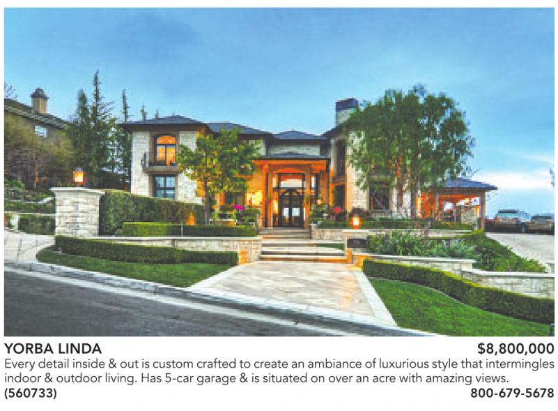 YORBA LINDA $8,800,000 Everydetailinside&out is custom craftedtocreateanambiance of luxurious stylethat intermingles indoor &outdoor living.Has 5-cargarage&issituatedonoveranacrewithamazing views. (560733) 800-679-5678