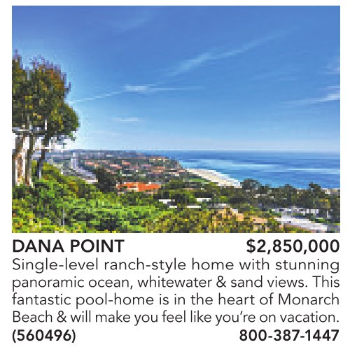 DANA POINT $2,850,000 Single-level ranch-style home with stunning panoramicocean,whitewater&sand views. This fantastic pool-home is in the heart of Monarch Beach&will make youfeellikeyou’reonvacation. (560496) 800-387-1447