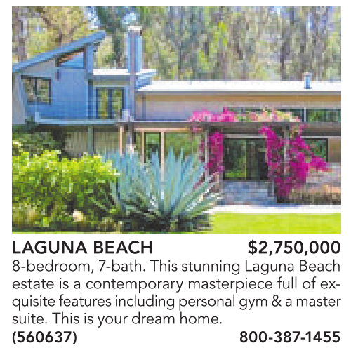 LAGUNA BEACH $2,750,000 8-bedroom,7-bath. This stunning Laguna Beach estate is a contemporary masterpiece full of exquisitefeaturesincluding personal gym&amaster suite. This is your dreamhome. (560637) 800-387-1455