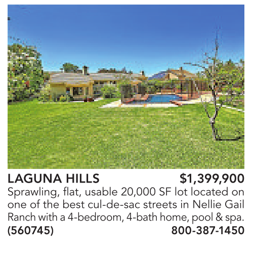 LAGUNA HILLS $1,399,900 Sprawling, flat, usable 20,000 SF lot located on one of the best cul-de-sac streets in Nellie Gail Ranchwitha4-bedroom,4-bathhome, pool &spa. (560745) 800-387-1450