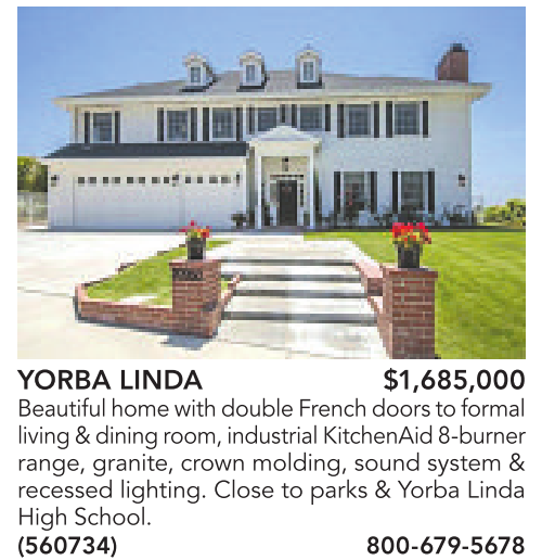 YORBA LINDA $1,685,000 Beautiful home with doubleFrenchdoors to formal living &diningroom,industrial KitchenAid 8-burner range, granite, crown molding, sound system & recessed lighting. Close to parks & Yorba Linda HighSchool. (560734) 800-679-5678