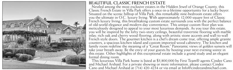 This luxurious Villa Park home is listed at $3,800,000 by First Team® agents Cindee Cano and Michael Arshaid. For a private showing or more information, please contact Cindee Cano and Michael Arshaid at (714) 420-4234 or via email at Info@cindeeandmichael.com.