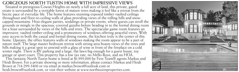 This fantastic North Tustin home is listed at $1,995,000 by First Team® agents Markus and Heidi Brown. For a private showing or more information, please contact Markus and Heidi Brown at 714-299-3400 or via email at markus.brown@outlook.com or heidi.brown@outlook.com, or visit their website at www.northtustinproperties.com.
