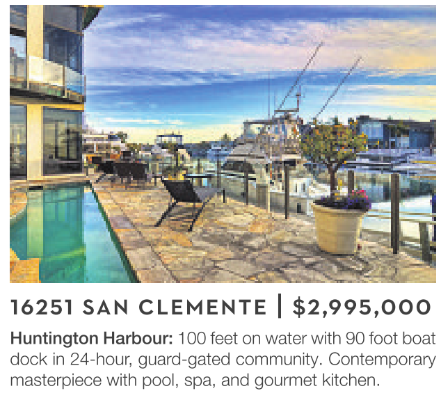 Huntington Harbour: 100 feet on water with 90 foot boat dock in 24-hour, guard-gated community. Contemporary masterpiece with pool, spa, and gourmet kitchen.