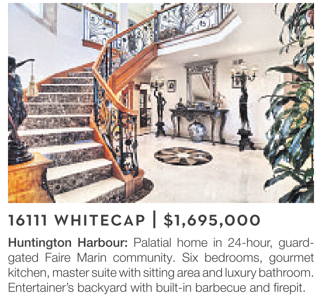 Huntington Harbour: Palatial home in 24-hour, guardgated Faire Marin community. Six bedrooms, gourmet kitchen, master suite with sitting area and luxury bathroom. Entertainer’s backyard with built-in barbecue and firepit.