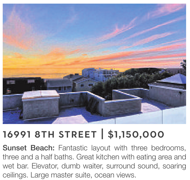 Sunset Beach: Fantastic layout with three bedrooms, three and a half baths. Great kitchen with eating area and wet bar. Elevator, dumb waiter, surround sound, soaring ceilings. Large master suite, ocean views.