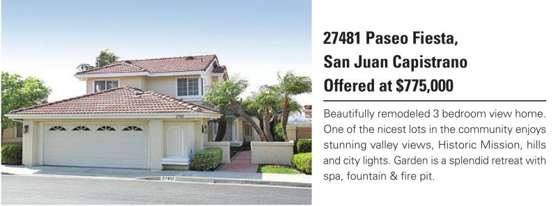 27481 Paseo Fiesta, San Juan Capistrano Offered at $775,000 Beautifully remodeled 3 bedroom view home. One of the nicest lots in the community enjoys stunning valley views, Historic Mission, hills and city lights. Garden is a splendid retreat with spa, fountain & fire pit.