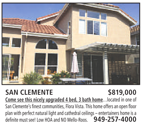 SAN CLEMENTE $819,000 Come see this nicely upgraded 4bed, 3bath home…located in one of SanClemente’s finestcommunities,Flora Vista. This home offersanopenfloor plan with perfectnatural lightand cathedral ceilings –entertainershome is a definite must see! LowHOA andNOMello-Roos. 949-257-4000