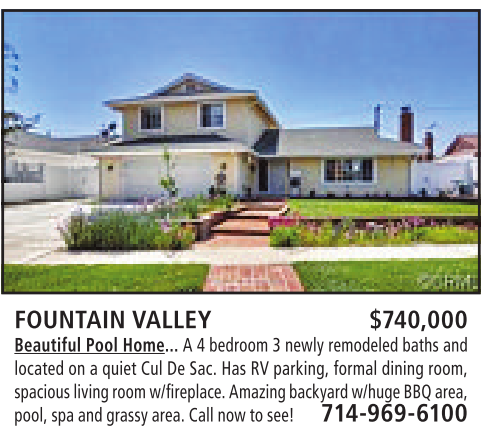 located onaquiet Cul De Sac. Has RVparking, formal dining room, spacious living room w/fireplace.Amazing backyard w/huge BBQarea, pool, spaand grassy area.Callnow to see! 714-969-6100