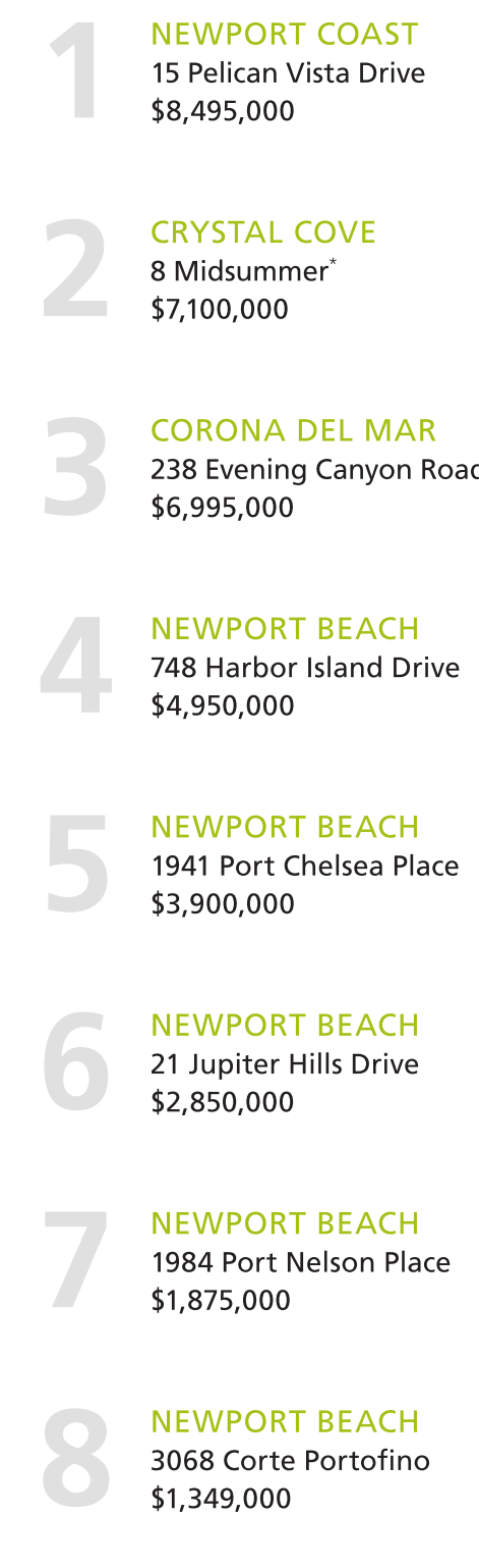 1 2 NEWPORT COAST 15 Pelican Vista Drive $8,495,000 CRYSTAL COVE 8 Midsummer * $7,100,000 3 CORONA DEL MAR 238 Evening Canyon Road $6,995,000 4 5 NEWPORT BEACH 748 Harbor Island Drive $4,950,000 NEWPORT BEACH 1941 Port Chelsea Place $3,900,000 6 7 NEWPORT BEACH 21 Jupiter Hills Drive $2,850,000 NEWPORT BEACH 1984 Port Nelson Place $1,875,000 8 NEWPORT BEACH 3068 Corte Portofino $1,349,000