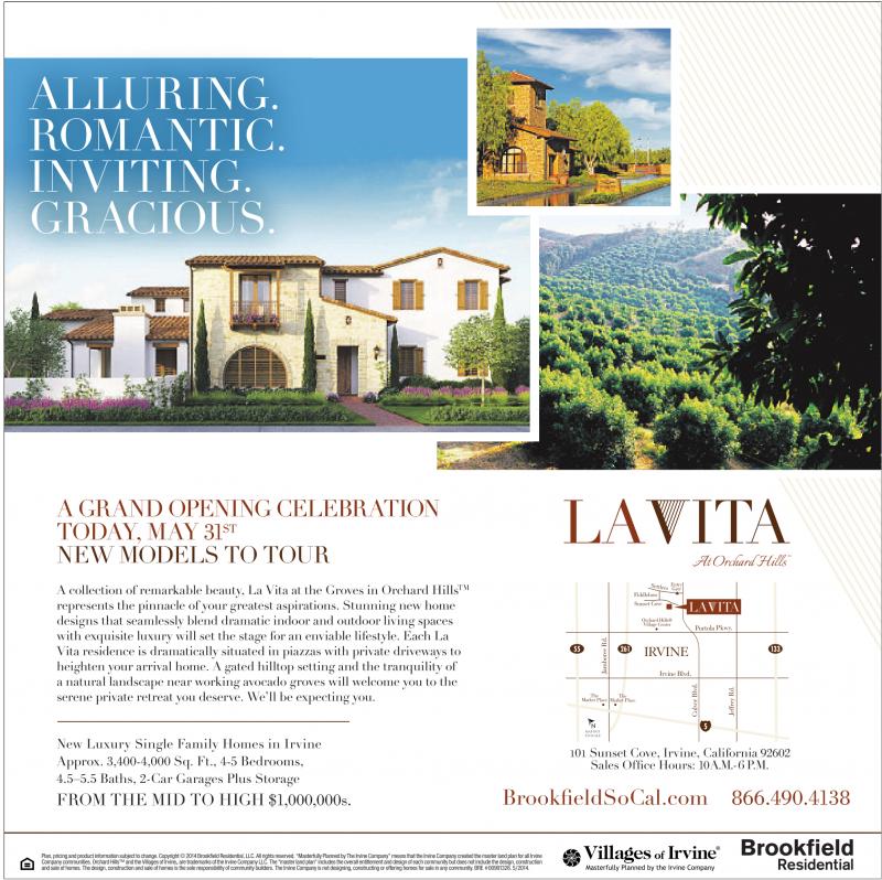 Plan, pricing and product information subject to change. Copyright ©2014 Brookfield Residential, LLC. All rights reserved. “Masterfully Planned by The Irvine Company” means that the Irvine Company created the master land plan for all Irvine Company communities. Orchard Hills™ and the Villages of Irvine ® are trademarks of the Irvine Company LLC. The “master land plan”includes the overall entitlement and design of each community but does not include the design, construction and sale of homes. The design, construction and sale of homes is the sole responsibility of community builders. The Irvine Company is not designing, constructing or offering homes for sale in any community.BRE #00991326. 5/2014.