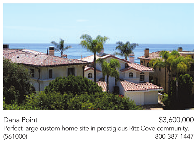 Dana Point $3,600,000 Perfect large custom home site in prestigious Ritz Cove community. (561000) 800-387-1447