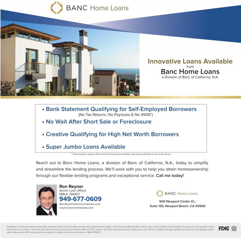 ©2014 Banc of California, National Association, dba Banc Home Loans. All rights reserved. Not all applicants will qualify. Some products offered by Banc Home Loans include modified documentation requirements and may have ahigher interest rate, more points or more fees than other products requiring documentation. Minimum FICO, reserve, and other requirements apply. Contact your Loan Officer for additional program guidelines, restrictions, and eligibility requirements. Rates, points, APR’s and programs are subject to change at any time until locked-in. NMLS #530611