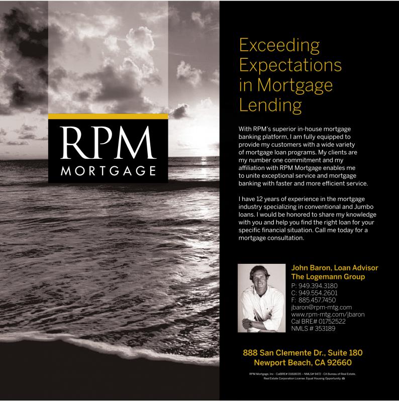 Exceeding Expectations in Mortgage Lending With RPM’s superior in-house mortgage banking platform, I am fully equipped to provide my customers with a wide variety of mortgage loan programs. My clients are my number one commitment and my affiliation with RPM Mortgage enables me to unite exceptional service and mortgage banking with faster and more efficient service. I have 12 years of experience in the mortgage industry specializing in conventional and Jumbo loans. I would be honored to share my knowledge with you and help you find the right loan for your specific financial situation. Call me today for a mortgage consultation. John Baron, Loan Advisor The Logemann Group P: 949.394.3180 C: 949.554.2601 F: 885.457.7450 jbaron@rpm-mtg.com www.rpm-mtg.com/jbaron Cal BRE# 01752522 NMLS # 353189 888 San Clemente Dr., Suite 180 Newport Beach, CA 92660 RPM Mortgage, Inc -CalBRE# 01818035 –NMLS# 9472 -CABureauofRealEstate, Real Estate Corporation License. Equal Housing Opportunity.