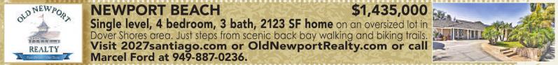 NEWPORT BEACH $1,435,000 Single level, 4 bedroom, 3 bath, 2123 SF home on an oversized lot in Dover Shores area. Just steps from scenic back bay walking and biking trails. Visit 2027santiago.com or OldNewportRealty.com or call Marcel Ford at 949-887-0236.