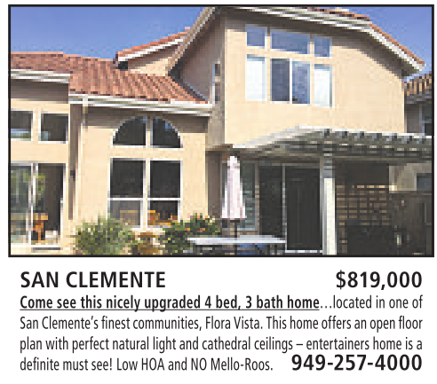 SanClemente’s finestcommunities,Flora Vista. This home offersanopenfloor plan with perfectnatural lightand cathedral ceilings –entertainershome is a definite must see! LowHOA andNOMello-Roos. 949-257-4000