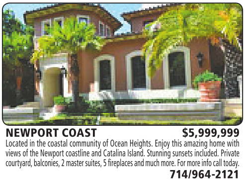 NEWPORT COAST $5,999,999 Located in the coastal community ofOcean Heights. Enjoy this amazing home with views ofthe Newport coastline and Catalina Island. Stunning sunsets included. Private courtyard,balconies, 2master suites, 5fireplaces andmuch more.For more infocalltoday.