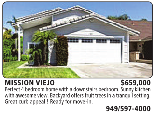 MISSION VIEJO $659,000 Perfect4bedroom home with adownstairsbedroom. Sunnykitchen with awesome view.Backyard offersfruit treesinatranquil setting. Greatcurbappeal!Ready formove-in.