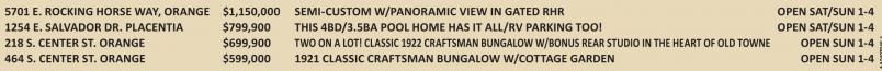 5701 E. ROCKING HORSE WAY, ORANGE $1,150,000 SEMI-CUSTOM W/PANORAMIC VIEW IN GATED RHR OPEN SAT/SUN 1-4 1254 E. SALVADOR DR. PLACENTIA $799,900 THIS 4BD/3.5BA POOL HOME HAS IT ALL/RV PARKING TOO! OPEN SAT/SUN 1-4 218 S. CENTER ST. ORANGE $699,900 TWOONALOT!CLASSIC 1922 CRAFTSMAN BUNGALOW W/BONUS REAR STUDIO IN THEHEART OF OLDTOWNE OPEN SUN 1-4 464 S. CENTER ST. ORANGE $599,000 1921 CLASSIC CRAFTSMAN BUNGALOW W/COTTAGE GARDEN OPEN SUN 1-4