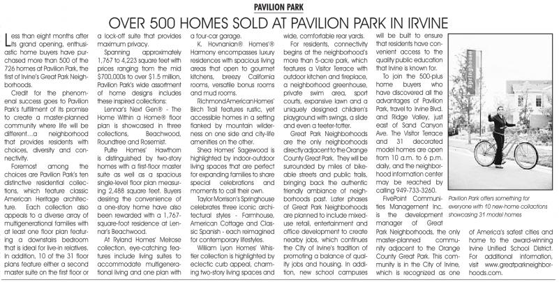 than eight months after its grand opening, enthusiastic home buyers have purchased more than 500 of the 726 homes at Pavilion Park, the first of Irvine’s Great Park Neighborhoods.