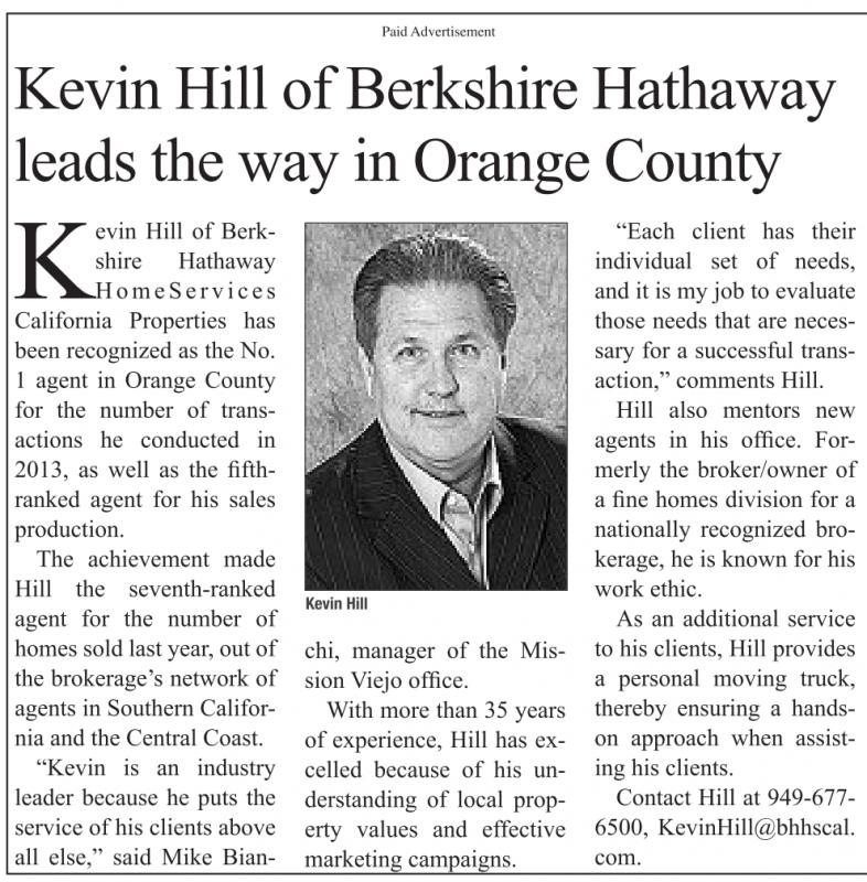 Paid Advertisement Kevin Hill of Berkshire Hathaway leads the way in Orange County Kevin Hill of Berkshire Hathaway HomeServices California Properties has been recognized as the No. 1 agent in Orange County for the number of transactions he conducted in 2013, as well as the fifthranked agent for his sales production. The achievement made Hill the seventh-ranked agent for the number of homes sold last year, out of the brokerage’s network of agents in Southern California and the Central Coast. “Kevin is an industry leader because he puts the service of his clients above all else,” said Mike Bian- Kevin Hill chi, manager of the Mission Viejo office. With more than 35 years of experience, Hill has excelled because of his understanding of local property values and effective marketing campaigns. “Each client has their individual set of needs, and it is my job to evaluate those needs that are necessary for a successful transaction,” comments Hill. Hill also mentors new agents in his office. Formerly the broker/owner of a fine homes division for a nationally recognized brokerage, he is known for his work ethic. As an additional service to his clients, Hill provides a personal moving truck, thereby ensuring a handson approach when assisting his clients. Contact Hill at 949-677- 6500, KevinHill@bhhscal. com. See also