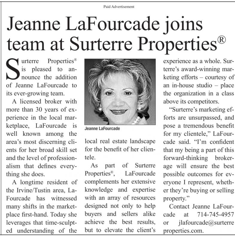 Contact Jeanne LaFourcade at 714-745-4957 or jlafourcade@surterre properties.com.