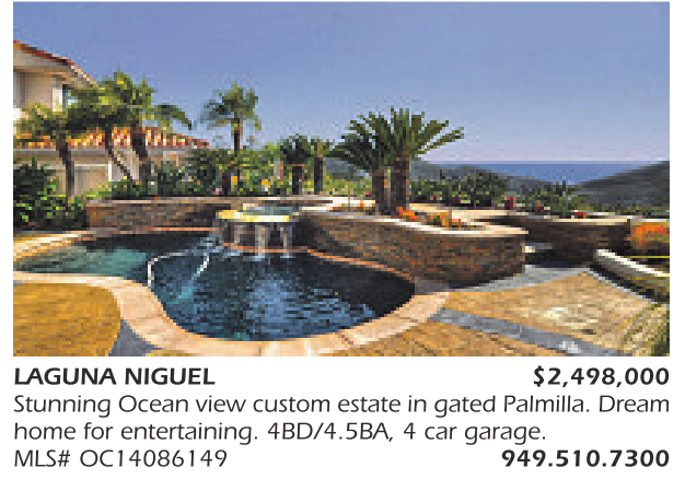 LAGUNA NIGUEL $2,498,000 Stunning Ocean view custom estate in gated Palmilla. Dream home for entertaining. 4BD/4.5BA, 4 car garage. MLS# OC14086149 949.510.7300