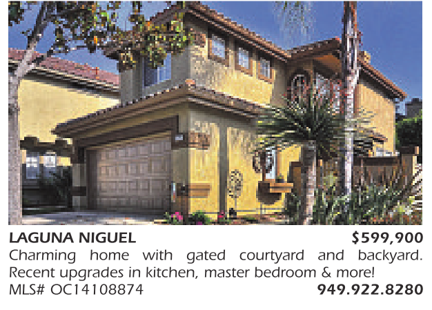 LAGUNA NIGUEL $599,900 Charming home with gated courtyard and backyard. Recent upgrades in kitchen, master bedroom & more! MLS# OC14108874 949.922.8280
