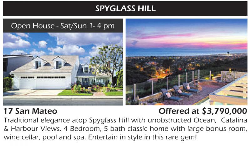 17 San Mateo Offered at $3,790,000 Traditional elegance atop Spyglass Hill with unobstructed Ocean, Catalina & Harbour Views. 4 Bedroom, 5 bath classic home with large bonus room, wine cellar, pool and spa. Entertain in style in this rare gem!