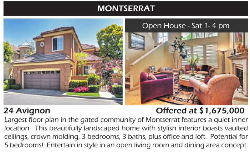 24 Avignon Offered at $1,675,000 Largest floor plan in the gated community of Montserrat features a quiet inner location. This beautifully landscaped home with stylish interior boasts vaulted ceilings, crown molding, 3 bedrooms, 3 baths, plus office and loft. Potential for 5 bedrooms! Entertain in style in an open living room and dining area concept.