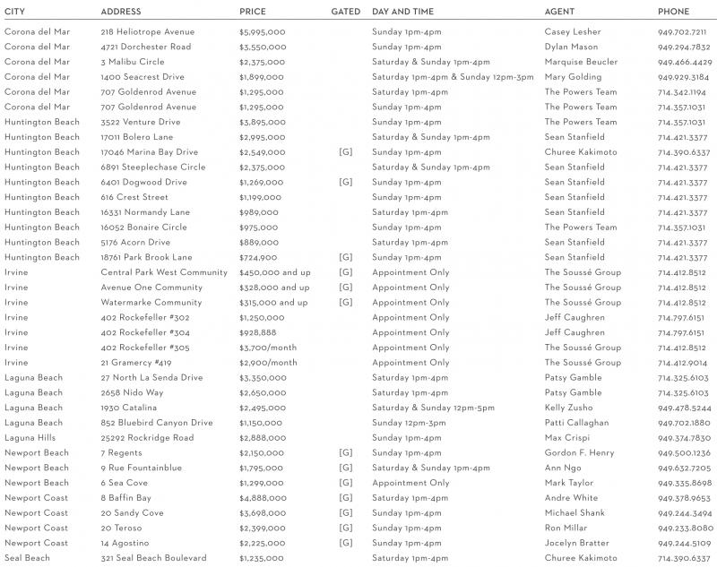CITY ADDRESS PRICE GATED DAY AND TIME AGENT PHONE Corona del Mar 218 Heliotrope Avenue $5,995,000 Sunday 1pm-4pm Casey Lesher 949.702.7211 Corona del Mar 4721 Dorchester Road $3,550,000 Sunday 1pm-4pm Dylan Mason 949.294.7832 Corona del Mar 3 Malibu Circle $2,375,000 Saturday & Sunday 1pm-4pm Marquise Beucler 949.466.4429 Corona del Mar 1400 Seacrest Drive $1,899,000 Saturday 1pm-4pm & Sunday 12pm-3pm Mary Golding 949.929.3184 Corona del Mar 707 Goldenrod Avenue $1,295,000 Saturday 1pm-4pm The Powers Team 714.342.1194 Corona del Mar 707 Goldenrod Avenue $1,295,000 Sunday 1pm-4pm The Powers Team 714.357.1031 Huntington Beach 3522 Venture Drive $3,895,000 Sunday 1pm-4pm The Powers Team 714.357.1031 Huntington Beach 17011 Bolero Lane $2,995,000 Saturday & Sunday 1pm-4pm Sean Stanfield 714.421.3377 Huntington Beach 17046 Marina Bay Drive $2,549,000 [G] Sunday 1pm-4pm Churee Kakimoto 714.390.6337 Huntington Beach 6891 Steeplechase Circle $2,375,000 Saturday & Sunday 1pm-4pm Sean Stanfield 714.421.3377 Huntington Beach 6401 Dogwood Drive $1,269,000 [G] Sunday 1pm-4pm Sean Stanfield 714.421.3377 Huntington Beach 616 Crest Street $1,199,000 Sunday 1pm-4pm Sean Stanfield 714.421.3377 Huntington Beach 16331 Normandy Lane $989,000 Saturday 1pm-4pm Sean Stanfield 714.421.3377 Huntington Beach 16052 Bonaire Circle $975,000 Sunday 1pm-4pm The Powers Team 714.357.1031 Huntington Beach 5176 Acorn Drive $889,000 Saturday 1pm-4pm Sean Stanfield 714.421.3377 Huntington Beach 18761 Park Brook Lane $724,900 [G] Sunday 1pm-4pm Sean Stanfield 714.421.3377 Irvine Central Park West Community $450,000 and up [G] Appointment Only The Soussé Group 714.412.8512 Irvine Avenue One Community $328,000 and up [G] Appointment Only The Soussé Group 714.412.8512 Irvine Watermarke Community $315,000 and up [G] Appointment Only The Soussé Group 714.412.8512 Irvine 402 Rockefeller #302 $1,250,000 Appointment Only Jeff Caughren 714.797.6151 Irvine 402 Rockefeller #304 $928,888 Appointment Only Jeff Caughren 714.797.6151 Irvine 402 Rockefeller #305 $3,700/month Appointment Only The Soussé Group 714.412.8512 Irvine 21 Gramercy #419 $2,900/month Appointment Only The Soussé Group 714.412.9014 Laguna Beach 27 North La Senda Drive $3,350,000 Saturday 1pm-4pm Patsy Gamble 714.325.6103 Laguna Beach 2658 Nido Way $2,650,000 Saturday 1pm-4pm Patsy Gamble 714.325.6103 Laguna Beach 1930 Catalina $2,495,000 Saturday & Sunday 12pm-5pm Kelly Zusho 949.478.5244 Laguna Beach 852 Bluebird Canyon Drive $1,150,000 Sunday 12pm-3pm Patti Callaghan 949.702.1880 Laguna Hills 25292 Rockridge Road $2,888,000 Sunday 1pm-4pm Max Crispi 949.374.7830 Newport Beach 7 Regents $2,150,000 [G] Sunday 1pm-4pm Gordon F. Henry 949.500.1236 Newport Beach 9 Rue Fountainblue $1,795,000 [G] Saturday & Sunday 1pm-4pm Ann Ngo 949.632.7205 Newport Beach 6 Sea Cove $1,299,000 [G] Appointment Only Mark Taylor 949.335.8698 Newport Coast 8 Baffin Bay $4,888,000 [G] Saturday 1pm-4pm Andre White 949.378.9653 Newport Coast 20 Sandy Cove $3,698,000 [G] Sunday 1pm-4pm Michael Shank 949.244.3494 Newport Coast 20 Teroso $2,399,000 [G] Sunday 1pm-4pm Ron Millar 949.233.8080 Newport Coast 14 Agostino $2,225,000 [G] Sunday 1pm-4pm Jocelyn Bratter 949.244.5109 Seal Beach 321 Seal Beach Boulevard $1,235,000 Saturday 1pm-4pm Churee Kakimoto 714.390.6337
