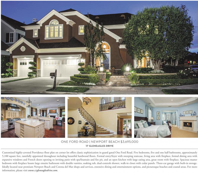 Customized highly-coveted Providence floor plan on corner lot offers classic sophistication in guard gated One Ford Road. Five bedrooms, five and one half bathrooms, approximately 5,100 square feet, tastefully appointed throughout including beautiful hardwood floors. Formal entry/foyer with sweeping staircase, living area with fireplace, formal dining area with expansive windows and French doors opening to inviting patio with spa/fountain and fire pit, and an open kitchen with large eating area, great room with fireplace. Spacious master bedroom with fireplace boasts large ensuite bathroom with double vanities, soaking tub, dual-controls shower, walk-in closet with cedar panels. Three-car garage with built-in storage. Ideally located near premium Newport Beach and Corona del Mar shops and services, extensive dining and entertainment options, and picturesque beaches and coastal areas. For more information, please visit www.17gleneaglesdrive.com.