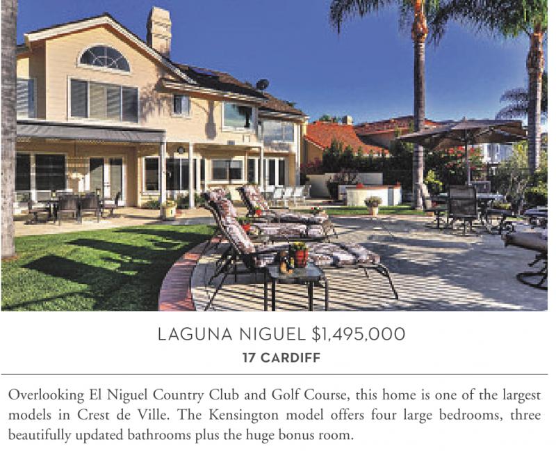 LAGUNA NIGUEL $1,495,000 17 CARDIFF Overlooking El Niguel Country Club and Golf Course, this home is one of the largest models in Crest de Ville. The Kensington model offers four large bedrooms, three beautifully updated bathrooms plus the huge bonus room.