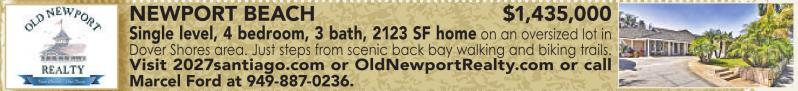 NEWPORT BEACH $1,435,000 Single level, 4 bedroom, 3 bath, 2123 SF home on an oversized lot in Dover Shores area. Just steps from scenic back bay walking and biking trails. Visit 2027santiago.com or OldNewportRealty.com or call Marcel Ford at 949-887-0236.