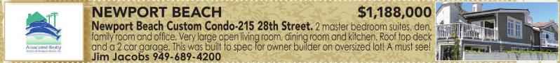 NEWPORT BEACH $1,188,000 Newport Beach Custom Condo-215 28th Street. 2 master bedroom suites, den, family room and office. Very large open living room, dining room and kitchen. Roof top deck and a 2 car garage. This was built to spec for owner builder on oversized lot! A must see! Jim Jacobs 949-689-4200