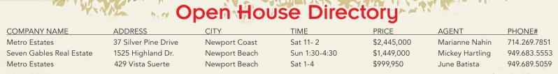 Open House Directory Open House Directory COMPANY NAME ADDRESS CITY TIME PRICE AGENT PHONE# Metro Estates 37 Silver Pine Drive Newport Coast Sat 11- 2 $2,445,000 Marianne Nahin 714.269.7851 Seven Gables Real Estate 1525 Highland Dr. Newport Beach Sun 1:30-4:30 $1,449,000 Mickey Hartling 949.683.5553 Metro Estates 429 Vista Suerte Newport Beach Sat 1-4 $999,950 June Batista 949.689.5059