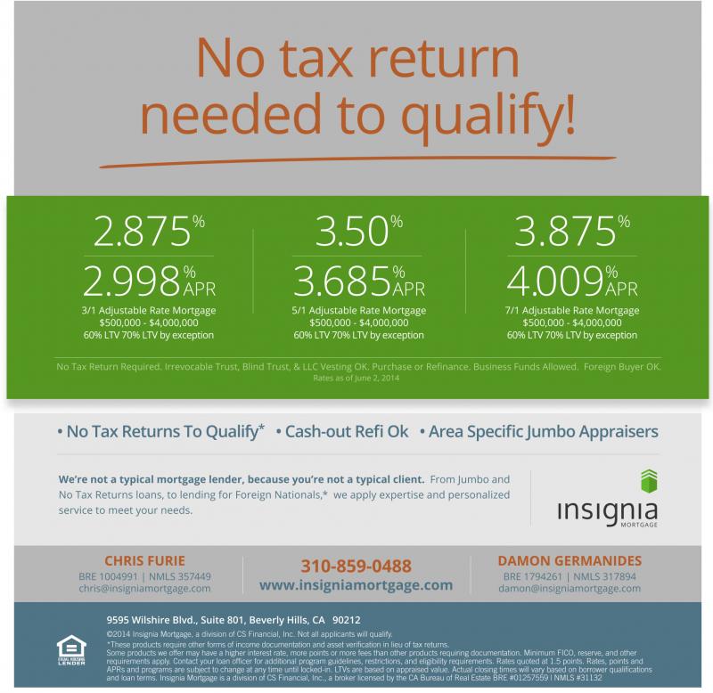 ©2014 Insignia Mortgage, a division of CS Financial, Inc. Not all applicants will qualify. *These products require other forms of income documentation and asset verification in lieu of tax returns. Some products we offer may have ahigher interest rate, more points or more fees than other products requiring documentation. Minimum FICO, reserve, and other requirements apply. Contact your loan officer for additional program guidelines, restrictions, and eligibility requirements. Rates quoted at 1.5 points. Rates, points and APRs and programs are subject to change at any time until locked-in. LTVs are based on appraised value. Actual closing times will vary based on borrower qualifications and loan terms. Insignia Mortgage is adivision of CS Financial, Inc., abroker licensed by the CA Bureau of Real Estate BRE #01257559 |NMLS #31132