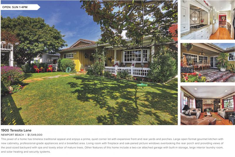 NEWPORT BEACH | $1,549,000 This jewel of a home has timeless traditional appeal and enjoys a prime, quiet corner lot with expansive front and rear yards and porches. Large open format gourmet kitchen with new cabinetry, professional-grade appliances and a breakfast area. Living room with fireplace and oak-paned picture windows overlooking the rear porch and providing views of the pool-sized backyard with spa and lovely arbor of mature trees. Other features of this home include a two-car attached garage with built-in storage, large interior laundry room, and solar heating and security systems.